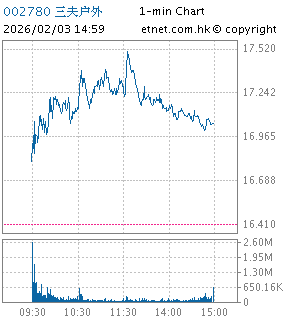 | 002780 | 三夫户外 | 17.050 | +0.640 | +3.900% | 6.37亿 | -- | ||